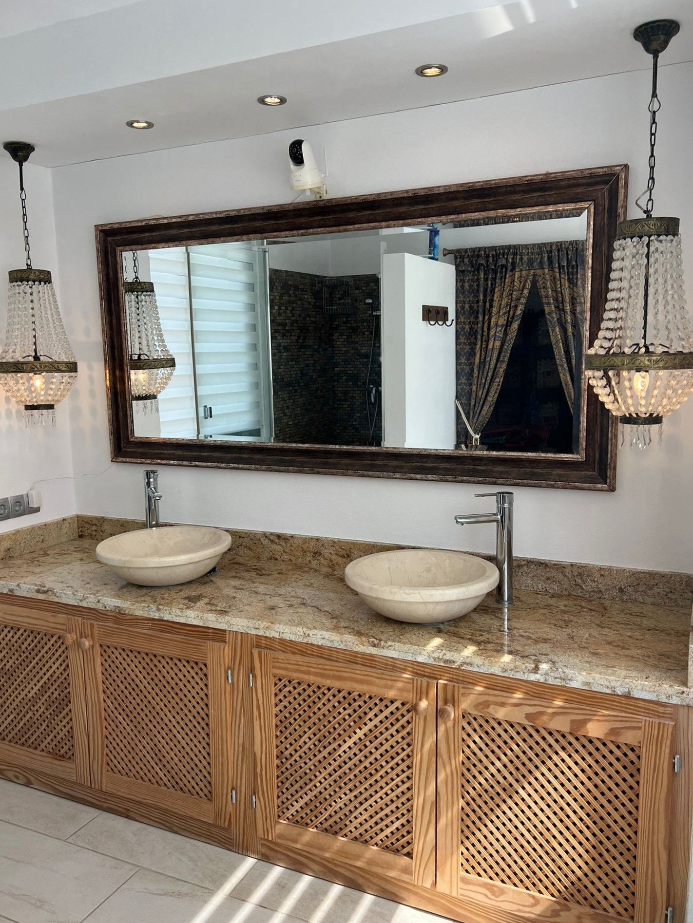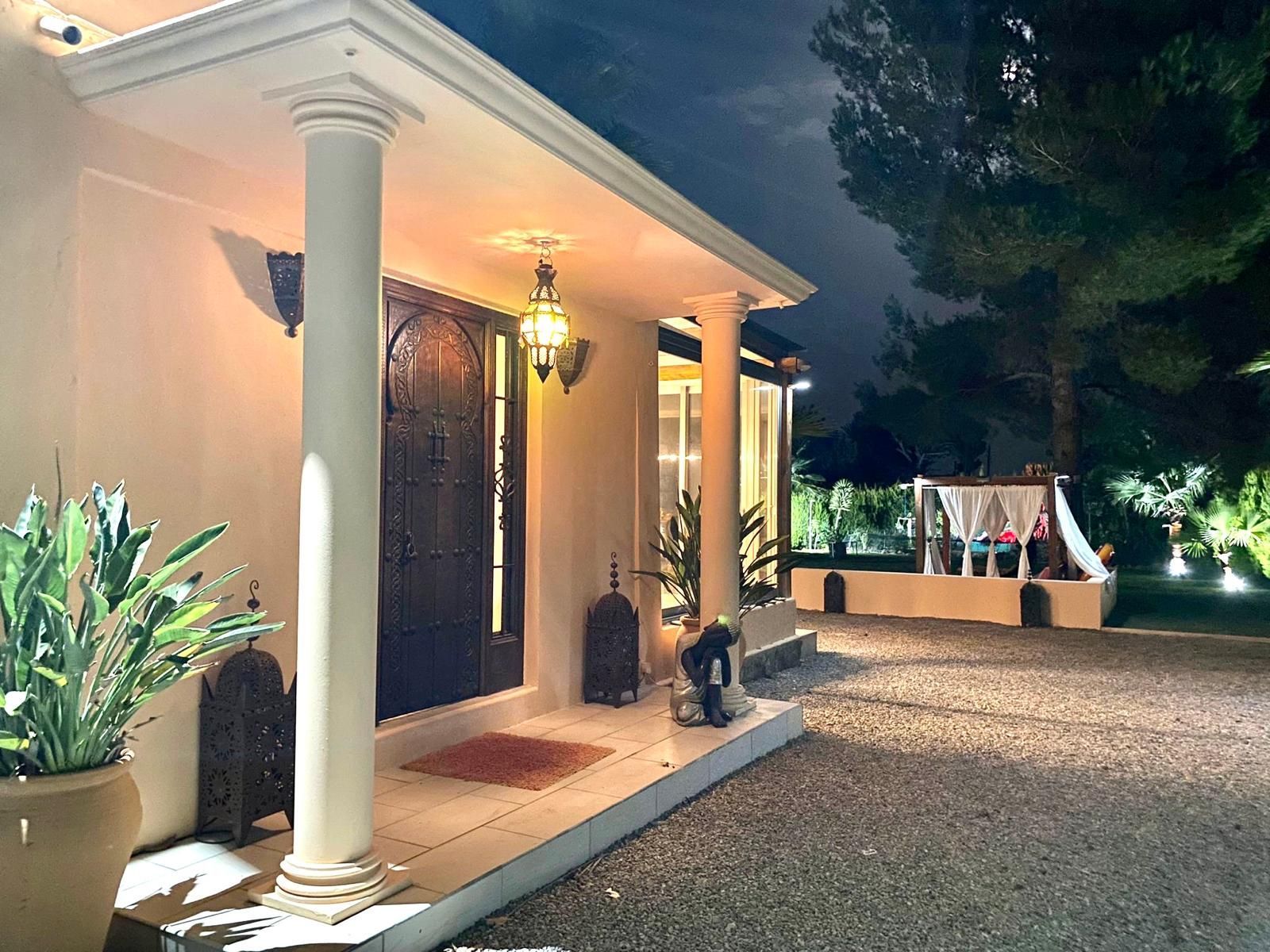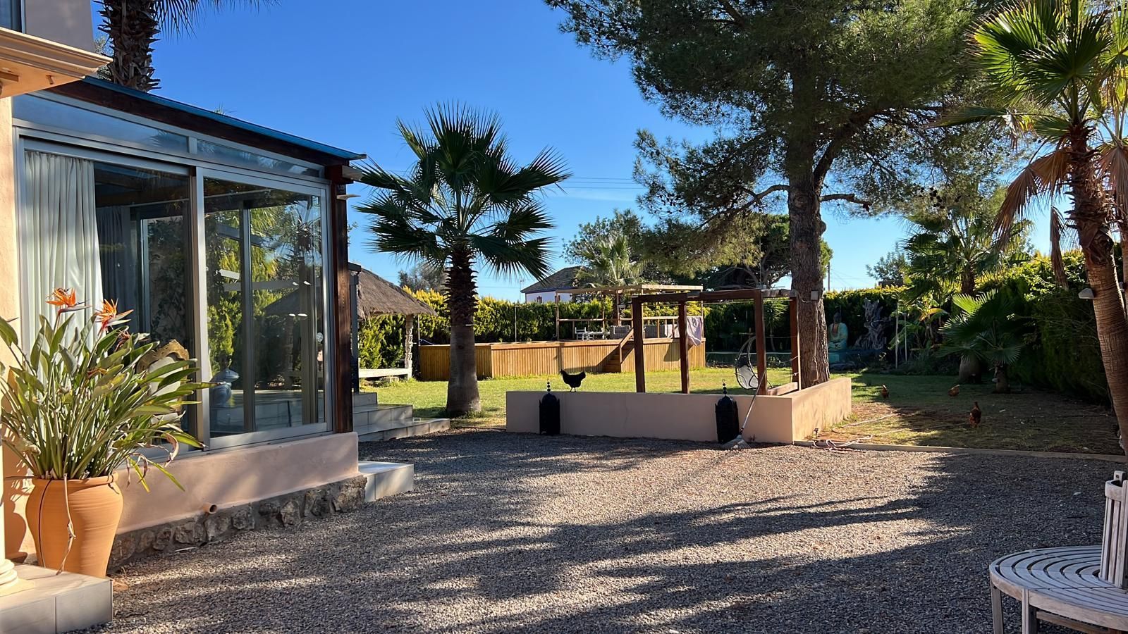 Zona exterior con 2 cocheras, jardín, estanque, taller, zona de piscina y chill out.