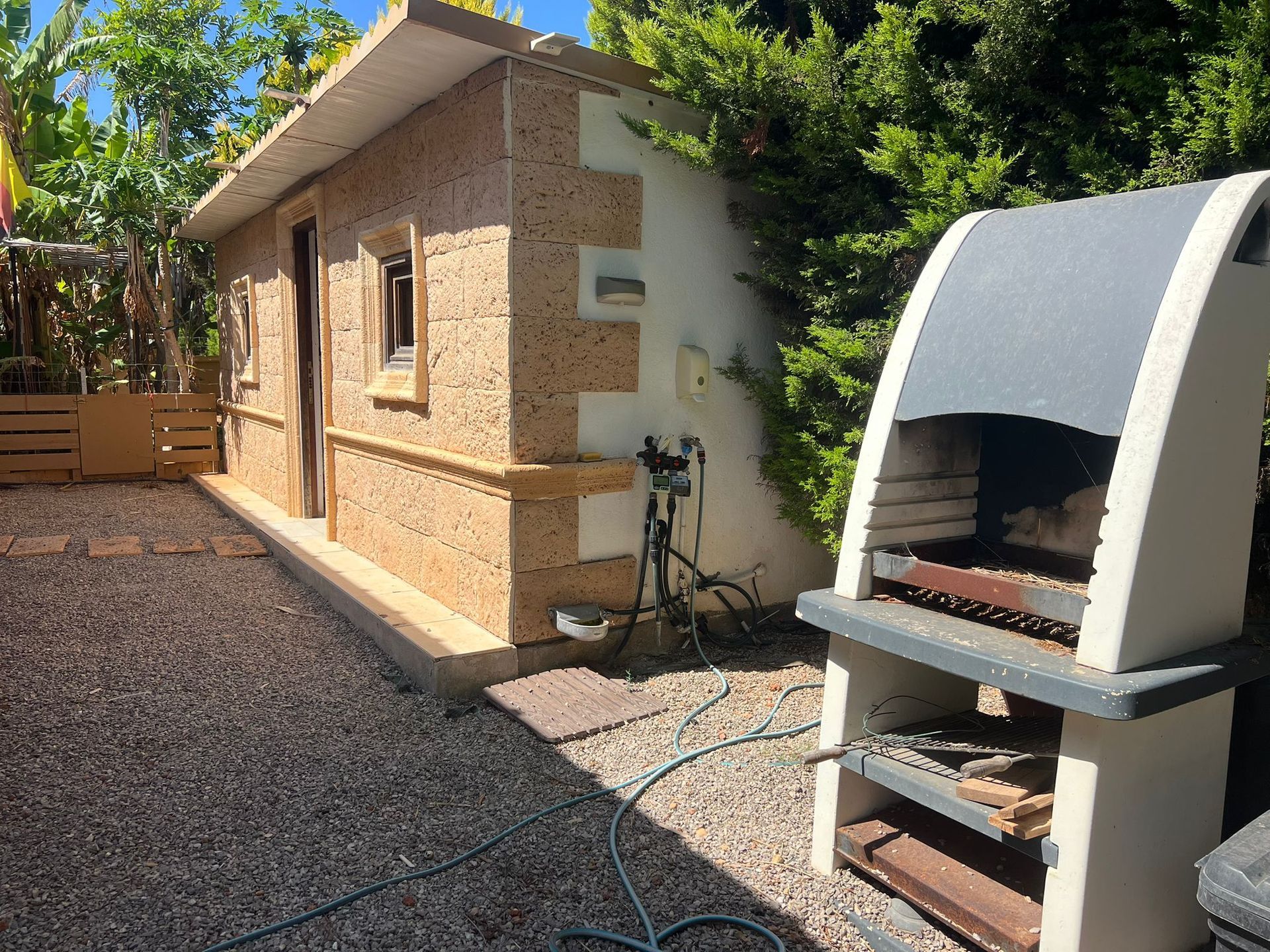 Aussenbereich mit 2 Carports , Garten, Fischteich, Workshop, Poolbereich und Chill Out